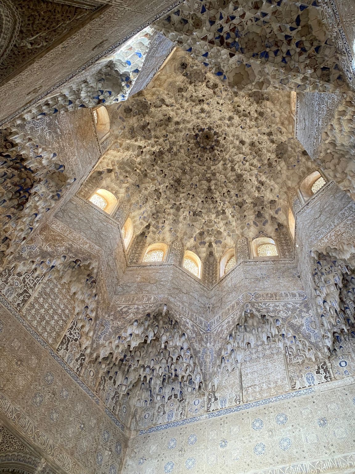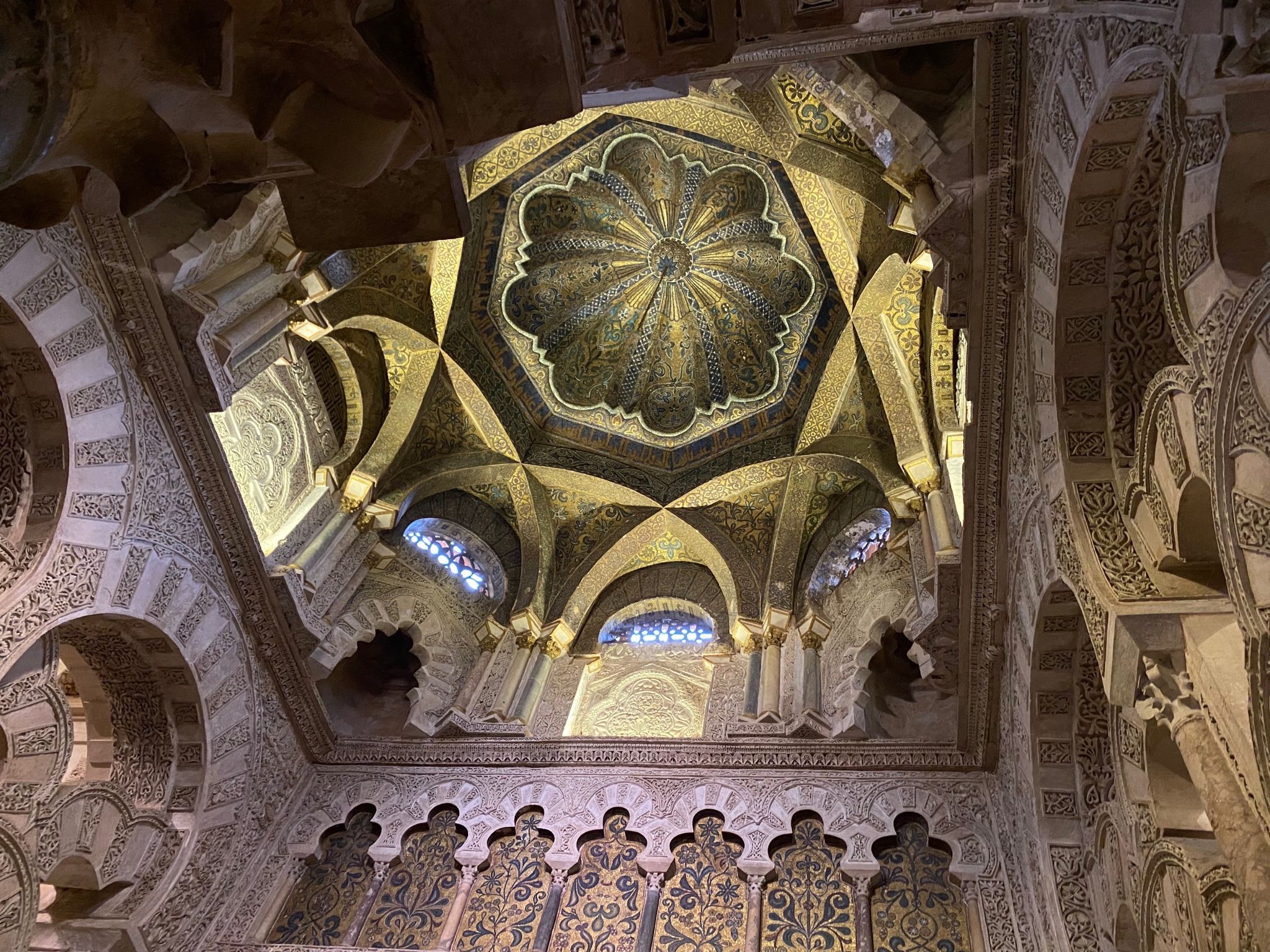 Read more.Al Andaluz is an area where many academic advances have been made as to how cultures interacted, what life was actually like. Who built the Alhambra? [1250] Where were they from? The answer is they were local. The invasion of Spain from Morroco had happened 500 years before – in 711 – by a combined islamic/jewish army. Islam had been European for half a millenium before the Alhambra was built. The ruling family came, originally, from Yemen which converted to Judaism in 600. When we consider the European tradition of architecture, our cultures are deeply intertwined. Pictured here a cieling at the Alhambra C13-14, and the Dome of the Cordova Mosque c. 960.