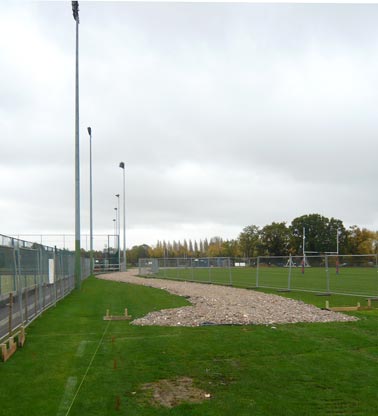Read more.The new sports pavilion at King’s College School, London is about to begin. This image shows the temporary road being laid and the setting out of the pavilion next to the astroturf pitches at West Barnes Lane, Raynes Park, London – November 2010
