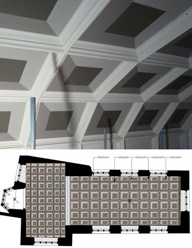 Oriel College Chapel’s grade 1 listed barrel vaulted ceiling is now visually subject to gravity with trompe l’oeil quadrants to suggest coffer or casket vaults between its timber ribs. This simple perspective technique suggests space beyond, and was much loved in the 17th century. The photo looks up at the first panels to be exposed to view from ground level, at the east end.