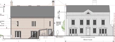 The Manor House, London, SW19, a listed farmhouse from the 17th or 18th century faced in brick, converted into offices, butch rear extension, the whole site car parked, is now about to breathe again as a residential house and garden. Alongside a barn-like new building containing 4 new residential eco-flats.