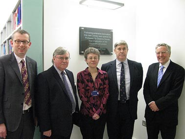 The photo shows Professor Anthony Smith (Principal and Dean), Mr James Gemmell (Honorary Treasurer), Mrs Michelle Wake (Chief Librarian & Head of Library and Information Services), Professor Sir Graeme Davies (Vice-Chancellor of the University of London), Lord Tim Clement-Jones (Chair of Council) Photo © School of Pharmacy.
