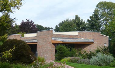 Using the natural slope of the land to achieve the raked auditorium. Its form responds to the historic crinkle-crankle garden wall nearby and to an ancient Yew tree adjacent to the building. Green credentials include locally sourced bricks – dug up form the earth within a mile of the site, untreated larch boarding and high levels of insulation and thermal mass, as well as a bio-diverse green roofs across the whole building.