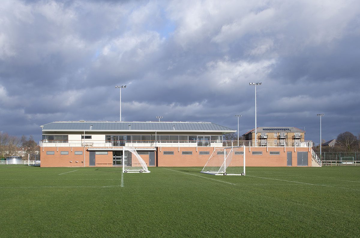 A new Pavilion for King’s College School at West Barnes Lane was completed in September 2011. It provides new twenty-first century facilities for twelve teams and staff, hospitality and ancillary facilities. A new car park accommodates 92 cars and two coaches, and a new grounds maintenance building with storage for tractors and materials. The pavilion is placed in the centre of the playing fields, with a tapering footprint to maintain the useable space for sports.